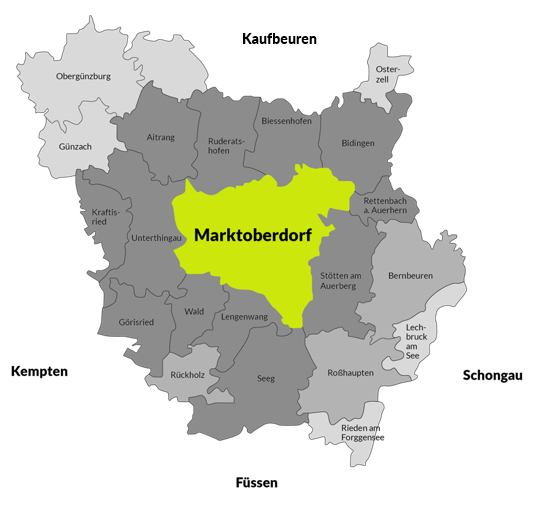 Als Kreisstadt des Landkreises Ostallgäu im bayerischen Regierungsbezirk Schwaben liegt Marktoberdorf zentral zwischen Kaufbeuren, Füssen, Kempten und Schongau, rund 100 km südwestlich von München. Die Stadt ist das kulturelle und wirtschaftliche Herz des Landkreises und bietet beste Voraussetzungen für nachhaltigen wirtschaftlichen Erfolg. Marktoberdorf ist damit ein idealer Standort für Unternehmen, die Wachstum, Stabilität und Lebensqualität verbinden möchten.